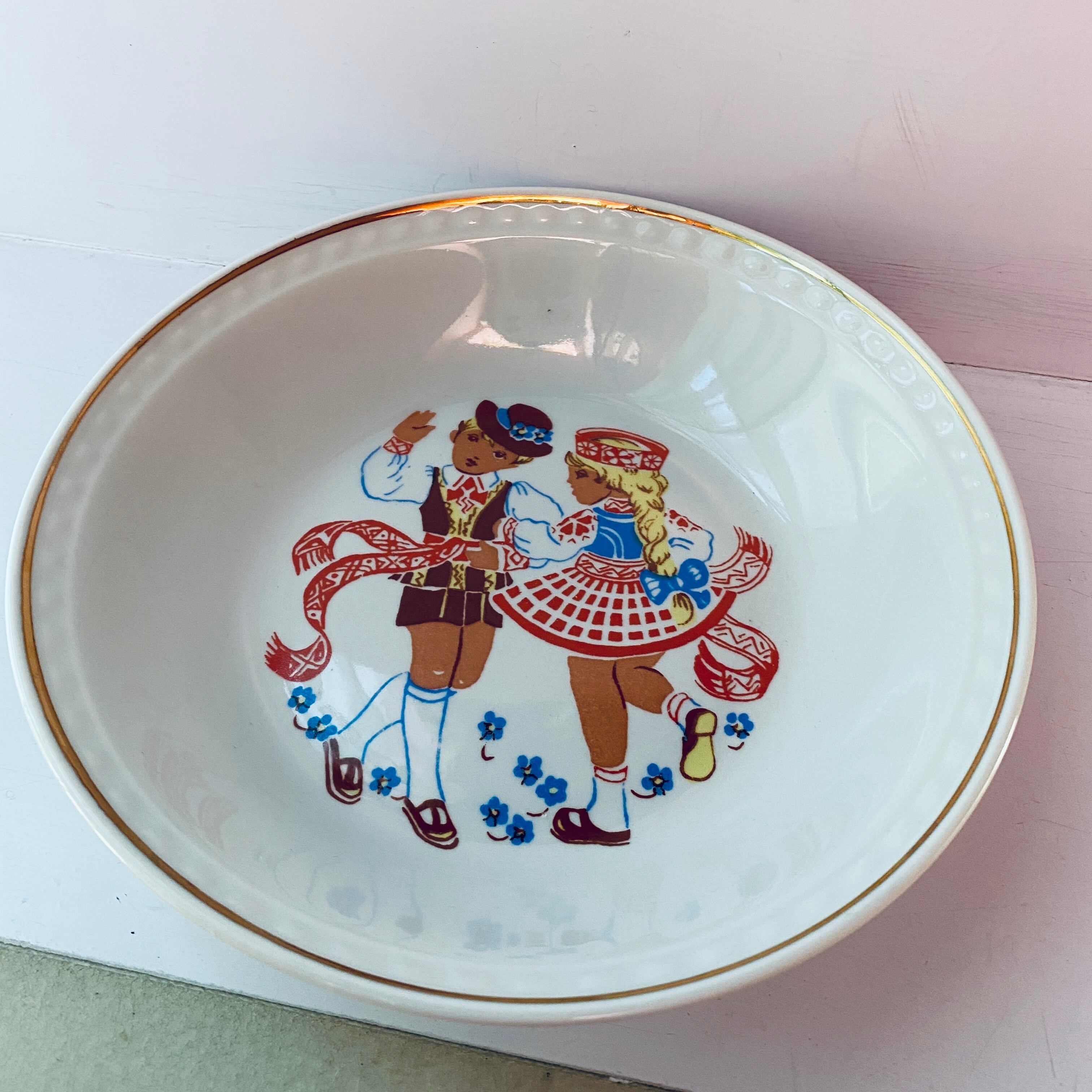 とーって可愛い、民族衣装を着た男の子、女の子のお皿です。
